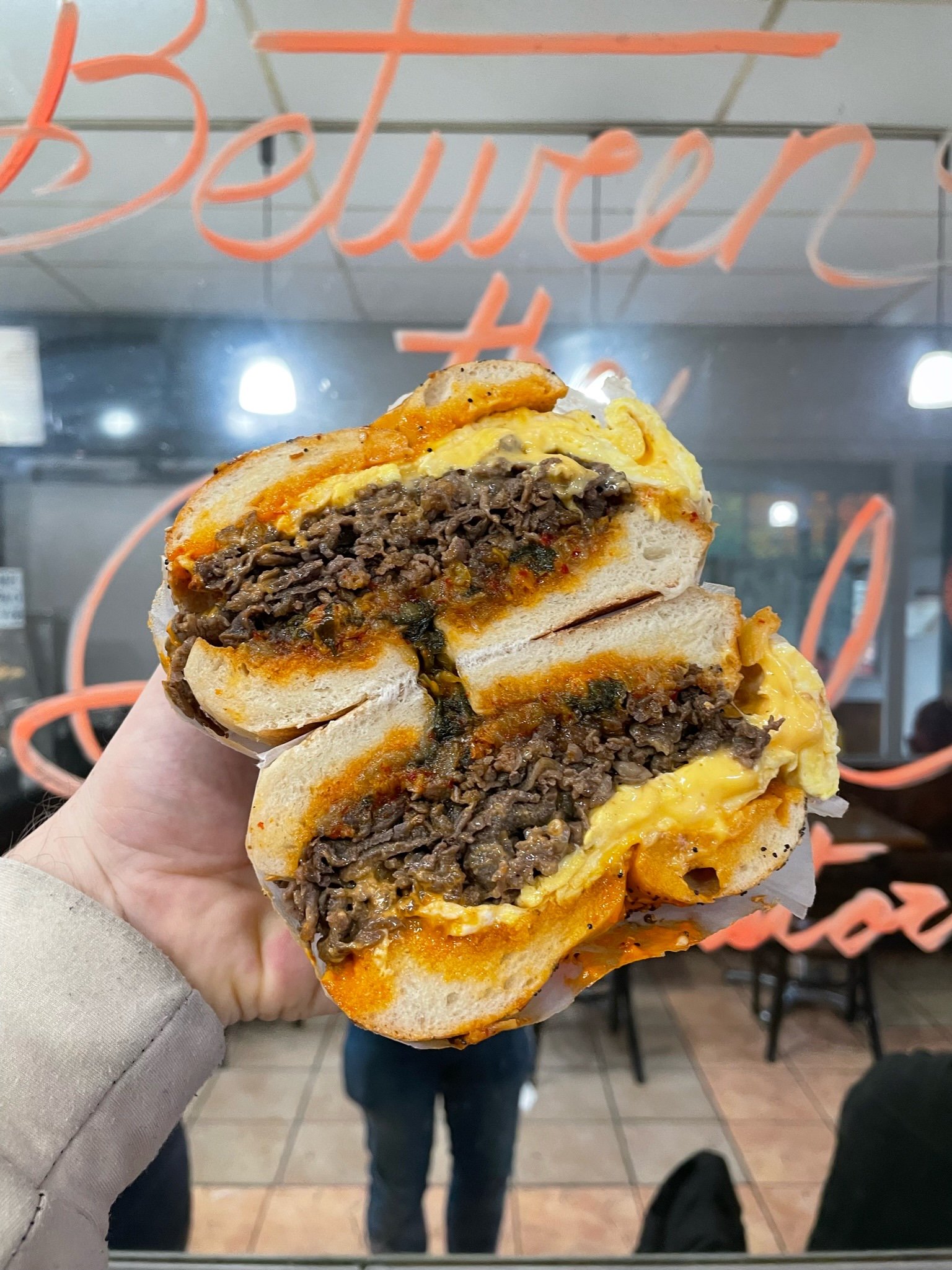 True to their name, Between the Bagel serves up generous portions of cream cheese, eggs, cheese and bacon, we recommend showing up hungry. On top of the heavy helpings of toppings (and on bottom of), these bagels are dense, with a tight crumb and a crispy crunch shell on the outside. These bagels can and will keep you full all day, if you can finish them. In a delightfully modern take, we recommend the Seoul Meets Bagel. Korea meets Queens with this bagel, which is Bulgogi, Egg, American Cheese, Sauteed Kimchi and Gochujang Mayo on your choice of bagel. As for your choice of bagel, we are would like to spotlight their Jalapeno Everything bagel- a truly unique mashup of two of New Yorks most popular bagels.