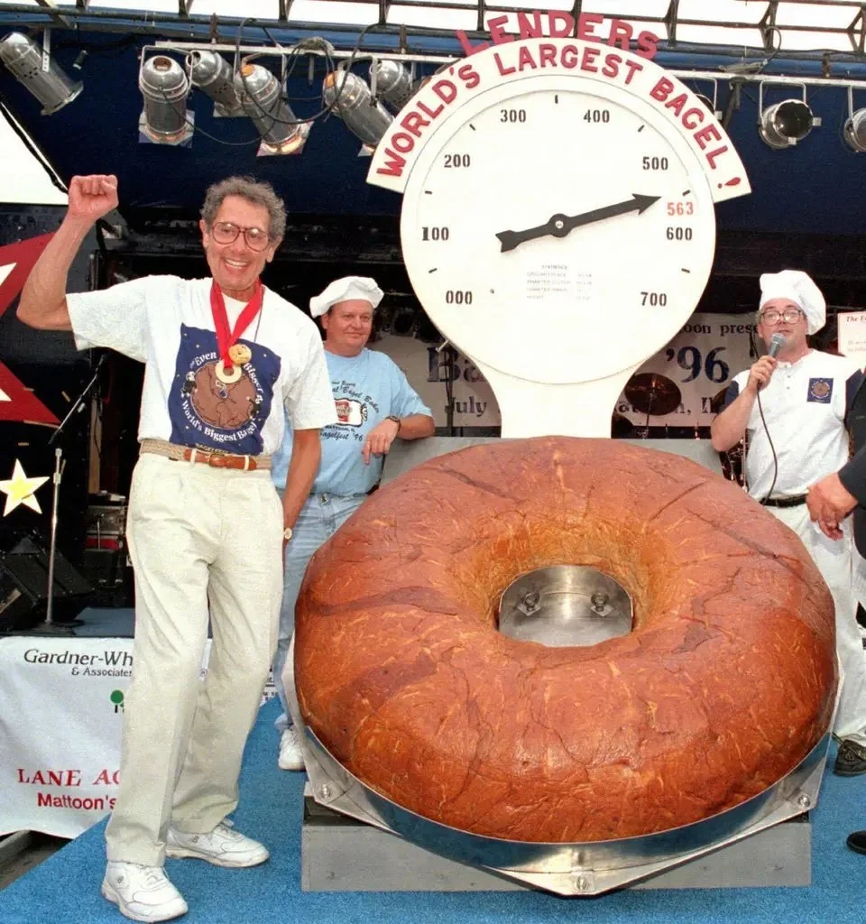Legendary bagel promoter Murray Lender with a world-record breaking 563-pound bagel in 1996. (New York Times)