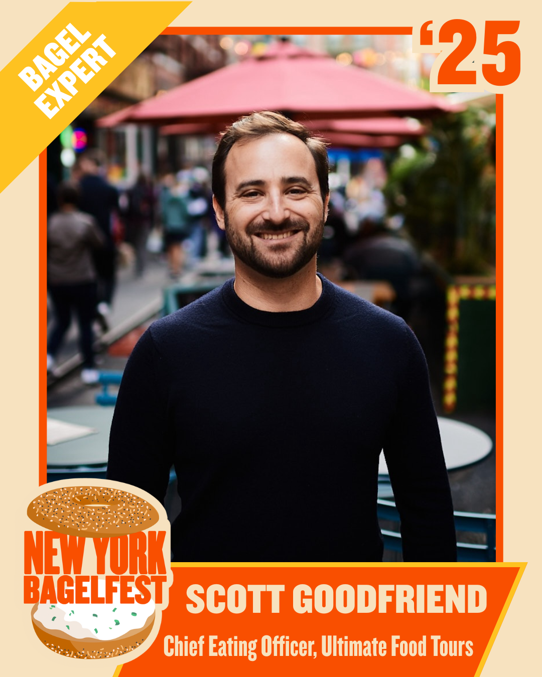 Scott Goodfriend is the Chief Eating Officer of Ultimate Food Tours in NYC. He leads people on tours and cooking classes so people can experience the best food and most interesting stories that New York City has to offer. About half of his tours feature a bagel from a different shop, and to his clients' benefit, he does not include his favorite bagel combo of a cinnamon raisin bagel with jalapeño CC anywhere on his tours.